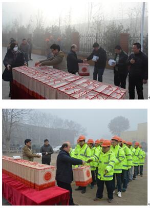 自入冬以來,濟(jì)南陸續(xù)出現(xiàn)大范圍霧霾天氣,為應(yīng)對(duì)連日來的霧霾天氣,最大程度保障項(xiàng)目一線職工的身心健康,工會(huì)緊急為全體員工購(gòu)買了專業(yè)防霧霾口罩,并及時(shí)組織安排,于12月29日上午,由集團(tuán)公司黨委副書記、副總經(jīng)理王國(guó)軍同志、工會(huì)主席侯仰進(jìn)同志、副總經(jīng)理高遵斌同志代表集團(tuán)黨委、工會(huì)將防霧霾口罩送到一線項(xiàng)目部的職工手中。同時(shí),元旦將至,為節(jié)日期間仍然堅(jiān)守在工作崗位的一線職工們送去節(jié)日的祝福和慰問品(即食熟食)。