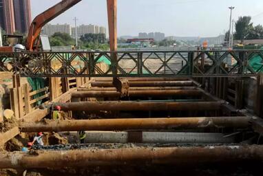 在飛躍大道與鳳岐路交叉口南側(cè)管廊連接段,近30米范圍內(nèi)恰逢15條東西向現(xiàn)狀管線“霸道”橫穿,包含成品油、原油、高壓燃?xì)?、東聯(lián)供水、雨水、污水等,且各管線高程不一,東聯(lián)供水埋深達(dá)7米,增加了管廊下翻深度,這無疑加大了施工難度,項(xiàng)目部為此邀請(qǐng)多位專家對(duì)溝槽支護(hù)形式進(jìn)行現(xiàn)場(chǎng)指導(dǎo),且嚴(yán)格按照經(jīng)專家論證后的論證方案施工。