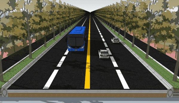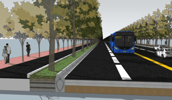 新產(chǎn)品將在禮耕路道路建設中得以使用。禮耕路本次實施段西起奧體西路,東至規(guī)劃路,道路總長約336.5米,規(guī)劃道路等級為城市次干路,紅線寬30米,設計采用雙向四車道的三塊板形式。新產(chǎn)品就應用在快速路的兩側,在施工前期,我們制作了三維效果圖,來展示新產(chǎn)品在實際應用中的效果。
